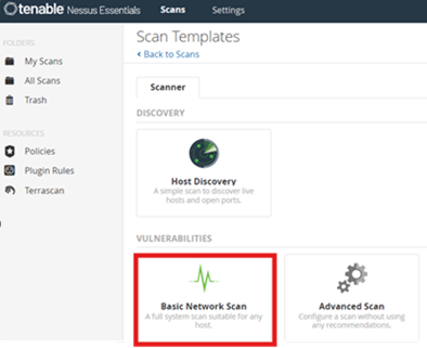 Temel bir ağ taraması yapmak için "Basic Network Scan" (Temel Ağ Taraması) şablonu seçilir.