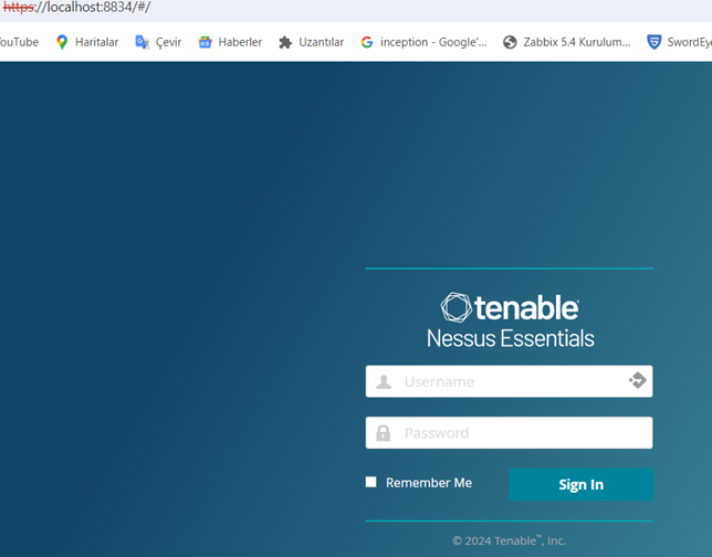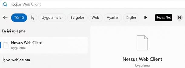 Başlat menüsünden Nessus uygulaması çalıştırılır veya tarayıcıda ‘https://localhost:8834’ adresine gidilir. Nessus kullanıcı adı ve parola ile giriş yapılır.