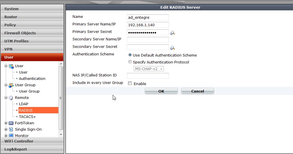 İlk olarak Fortigate üzerinde Radius ayarları yapılır. Örnekte Radius olarak bir NPS Server kurulmuş ve Active Directory deki kullanıcılar bu NPS Server a register edilmiştir.