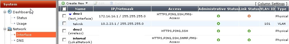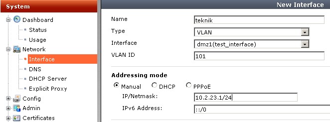 System>Interface sekmesi altında Create New diyerek yeni bir interface oluşturuyoruz. Type kısmında VLAN seçerek Name ve VLAN ID kısımlarını dolduruyoruz.