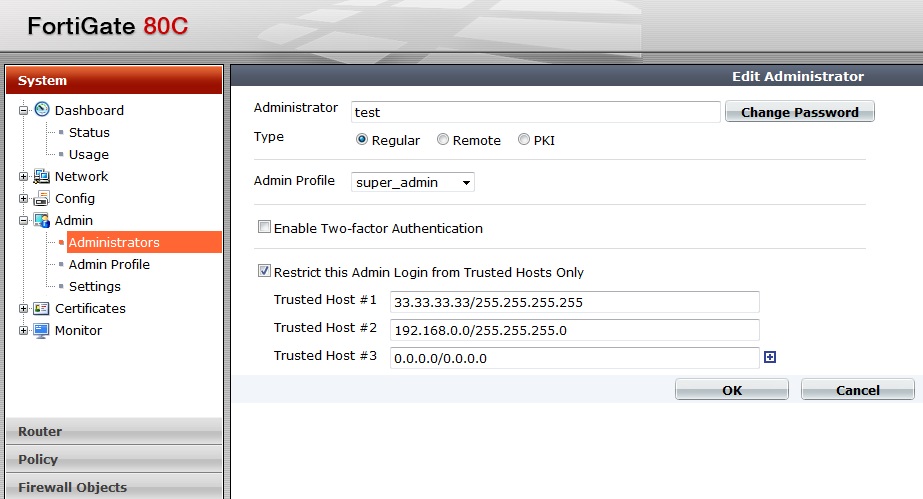 FortiGate MR3 ile birlikte bir çok özellikte değişiklikler meydana geldi. Bazı kullanıcılar admin veya diğer kullanıcı hesapları için trusted host oluşturma bilgisine sahip değiller. Bu işlem dışarıdan gelebilecek olası bir saldırı durumunu kesinlikle engelleyecektir. İşlemi gerçekleştirmek için sırası ile system - admin - administrators bölümüne geliyoruz. Daha sonra trusted host oluşturmak istediğim kullanıcı seçip editliyoruz ve Restrict this Admin Login from Trusted Hosts Only kutucuğunu işaretleyip dışarıdan ve içeriden bağlanacağımız ip adreslerimizi yazıyoruz.