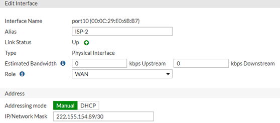 1- İlk olarak SD-WAN yapıma dahil edeceğim portlarıma IP atamalarını yapıyorum. Burada eklediğim IP, ISP’nin bana atadığı IP adresidir.