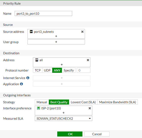 4- Port2 için internete çıkış yönünü port9 yani ISP-1; Port3 için internete çıkış yolunu Port10 yani ISP-2 için yapılandıracağım. Bunu SD-WAN Rule alt menüsünden yapabilirim.
