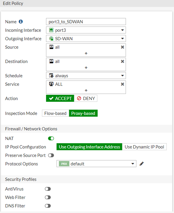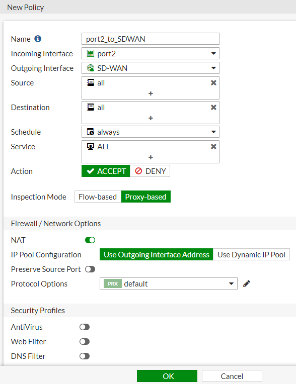 6- Firewall policy olmadan çalışmaz dolayısıyla şimdi bu yapıyı bir policy altında birleştireceğim. Port 2 ve Port3 için internete çıkışı SD-WAN ayarlayacağız.