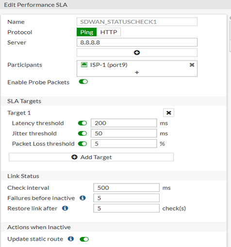 3- Bir hattın down olduğunu öğrenebilmek için Performance SLA menüsünden wan portları için kontrol mekanizmaları oluşturabiliriz. ISP-1 için Port9’un default gatewayine sürekli ping atması için bir kontrol mekanizması oluşturdum.